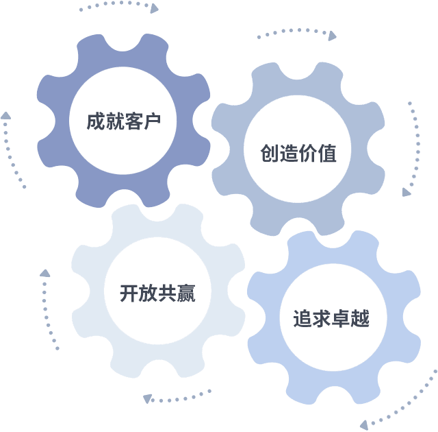 成就客户是一切决策的出发点,,创造价值是衡量所有工作的标准,,,,追求卓越是我们做事做人的态度,,,,开放共赢是我们的格局也是最终的结果。。价值观的齿轮环环相扣,,,,推动着组织里的每个人不断向前。。。